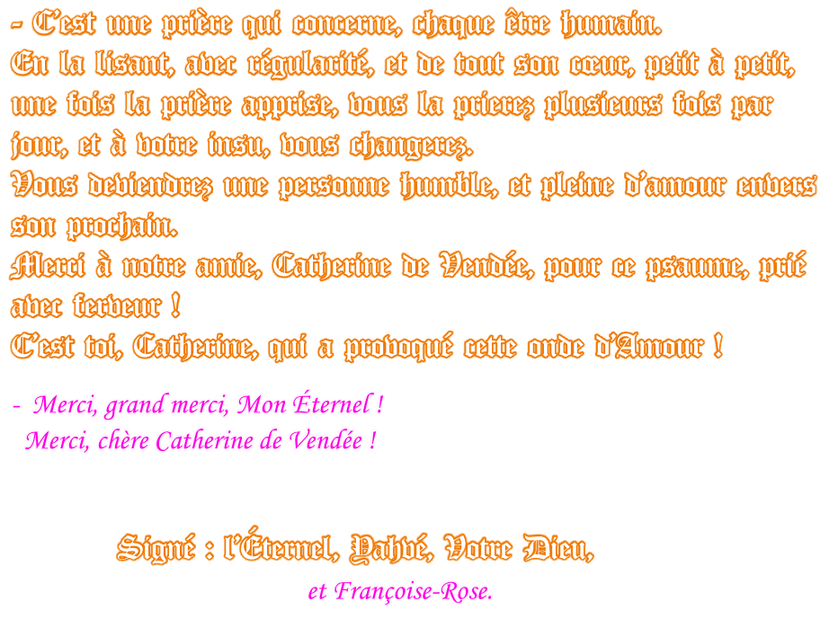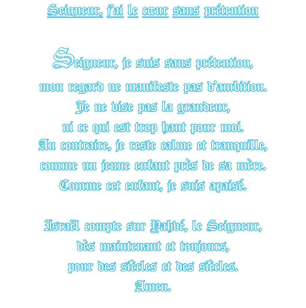 Psaume 131 (130) Retour à la page :   « Les prières spirituelles » Messages canalisés par Françoise-Rose,  le 1er Août  2018. - Ce Psaume 131 « Seigneur, j’ai le cœur sans prétention », Samuel, guide spirituel  de Jean-Paul, lui a dit que c’était « un bouclier d’amour ».  Si seulement toute la Terre l’apprenait et le priait, la Terre s’en porterait mieux !