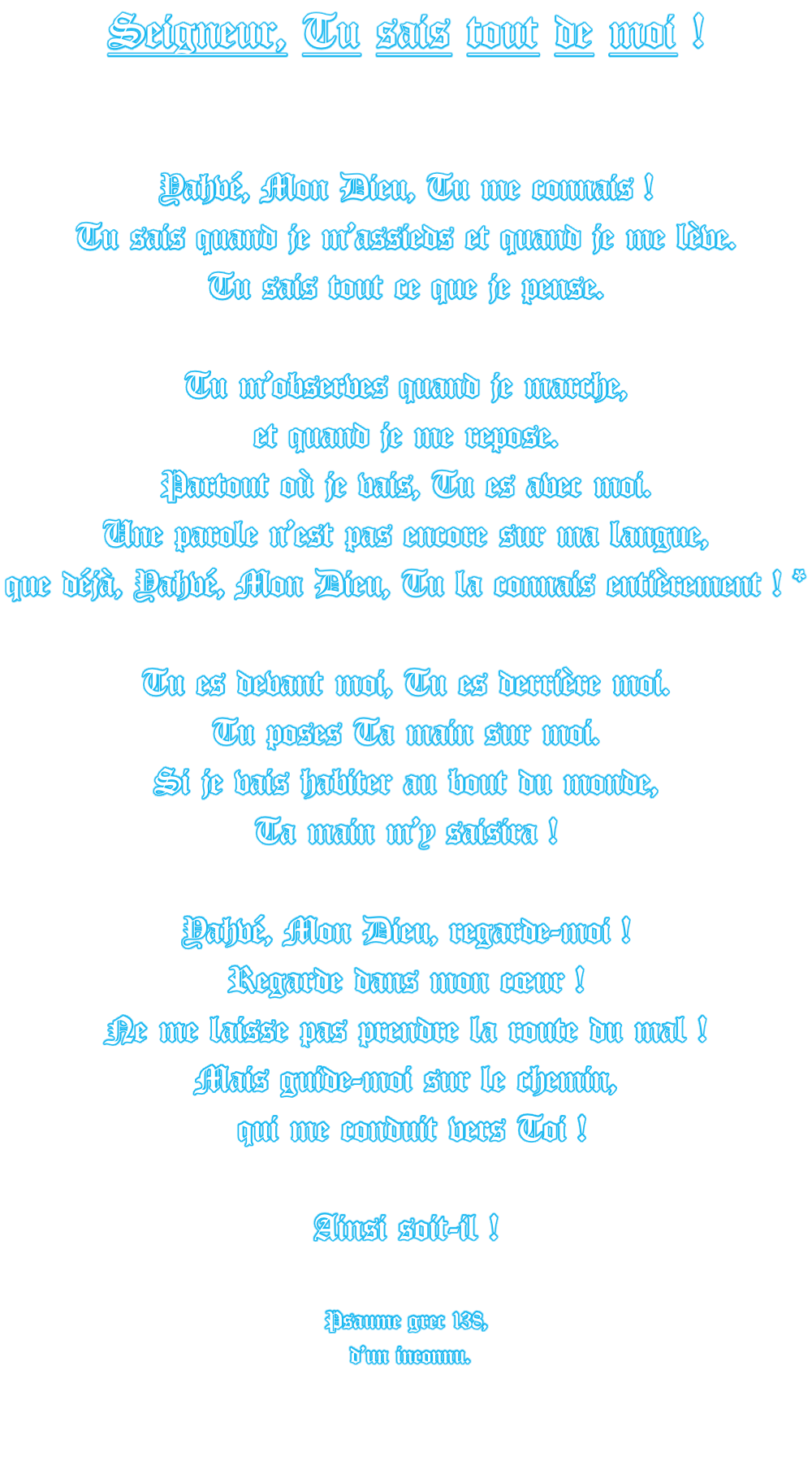 Psaume grec 138 * Oui, Françoise, la pensée va plus vite que les paroles, puisqu’il Faut penser ce qu’on va dire, avant de le formuler. Les psaumes sont à l’origine des chants de louange à l’Éternel, Yahvé, Notre Dieu, que l’on chantait en s’accompagant d’un instrument.  Musique : lyre celtique ancienne trouvée sur Youtube.  (SAMHAIN  -  Father and son  playing celtic lyra). Retour à la page :   « Les prières spirituelles » Message canalisé par Françoise-Rose,  le 1er Août  2018.