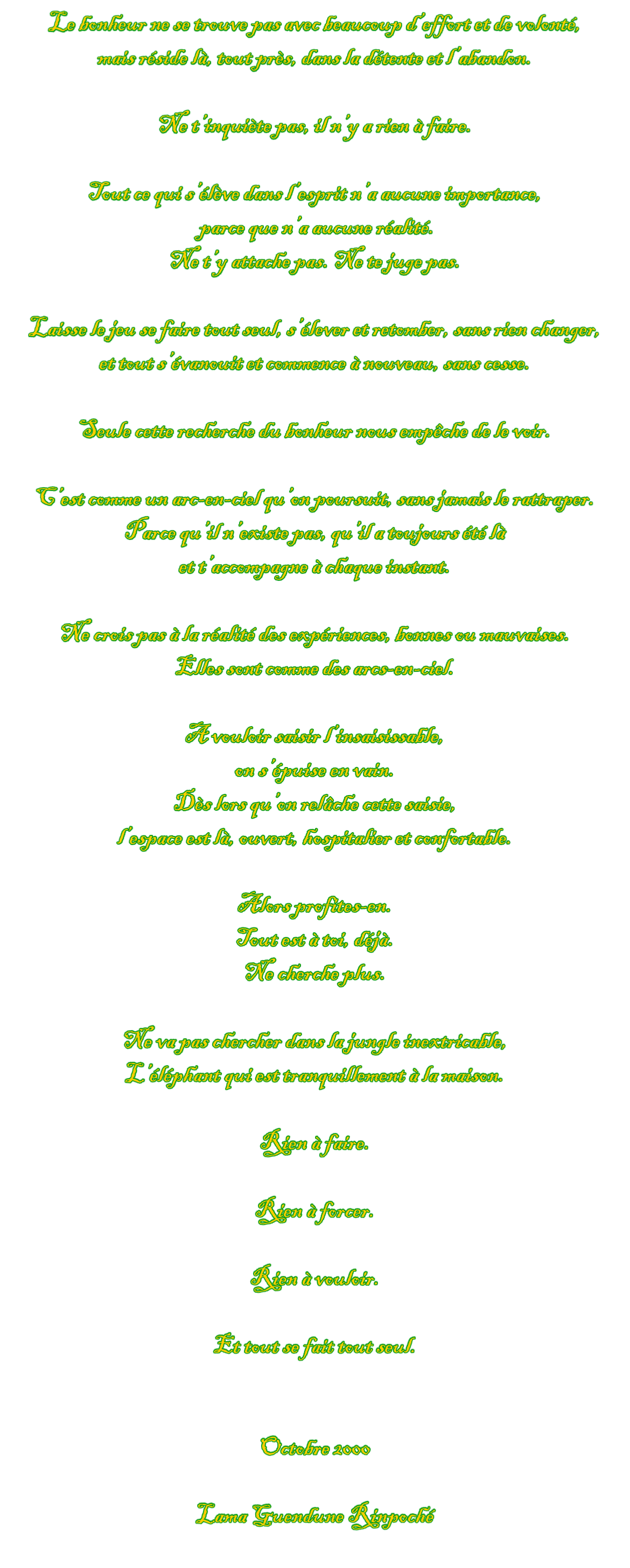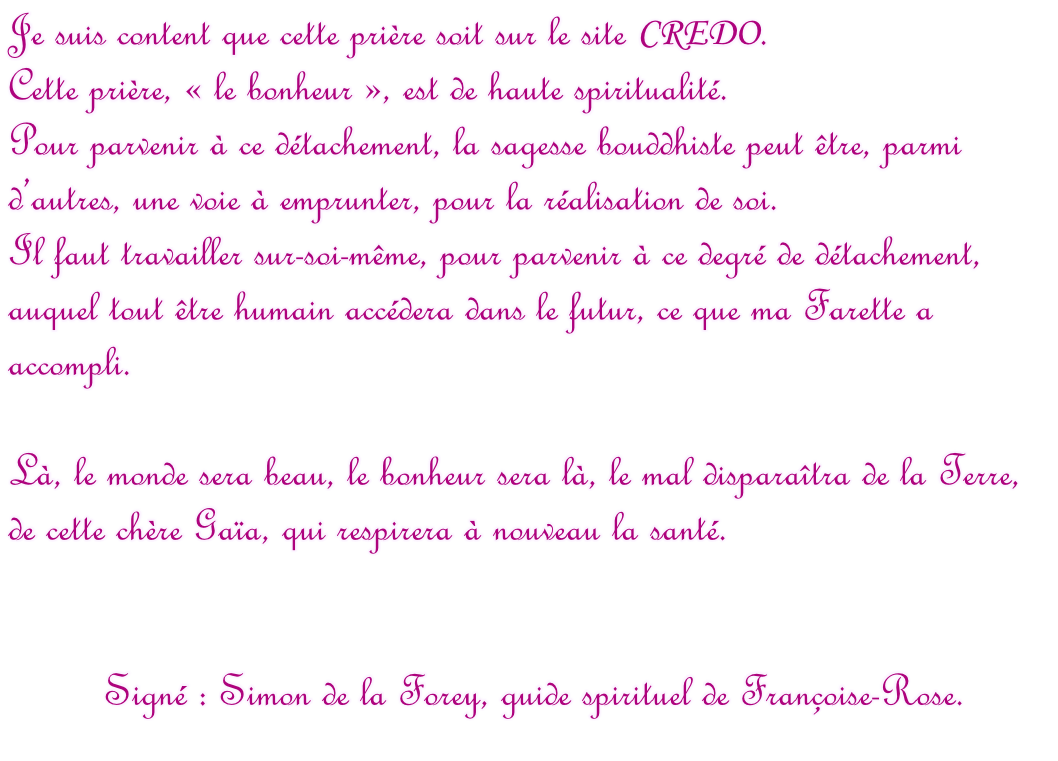 Le bonheur Retour à la page :   « Les prières spirituelles » Précepte trouvé sur internet, sur un site  bouddhiste (auteur inconnu) « Chaque acte qu’une personne effectue, lui revient d’une manière ou d’une autre. Pour briser cette chaîne de cause à effet, il faut toujours agir de manière à éviter de causer du tort à soi-même, ou à autrui. » Messages canalisés  par Françoise-Rose,   du 3 au 8 Janvier 2021.